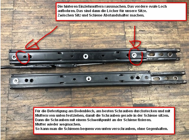 Nein, die Sitzfläche geht unter die Anschraubpunkte. Unsere Sitze können also nur mit Abstandshaltern oder Sitzkonsolen direkt auf den Boden verschraubt werden. Man kommt nicht weiter runter. Der “Arsch” ist also auch mit Schienen eigentlich schon direkt auf dem Boden. ![]()