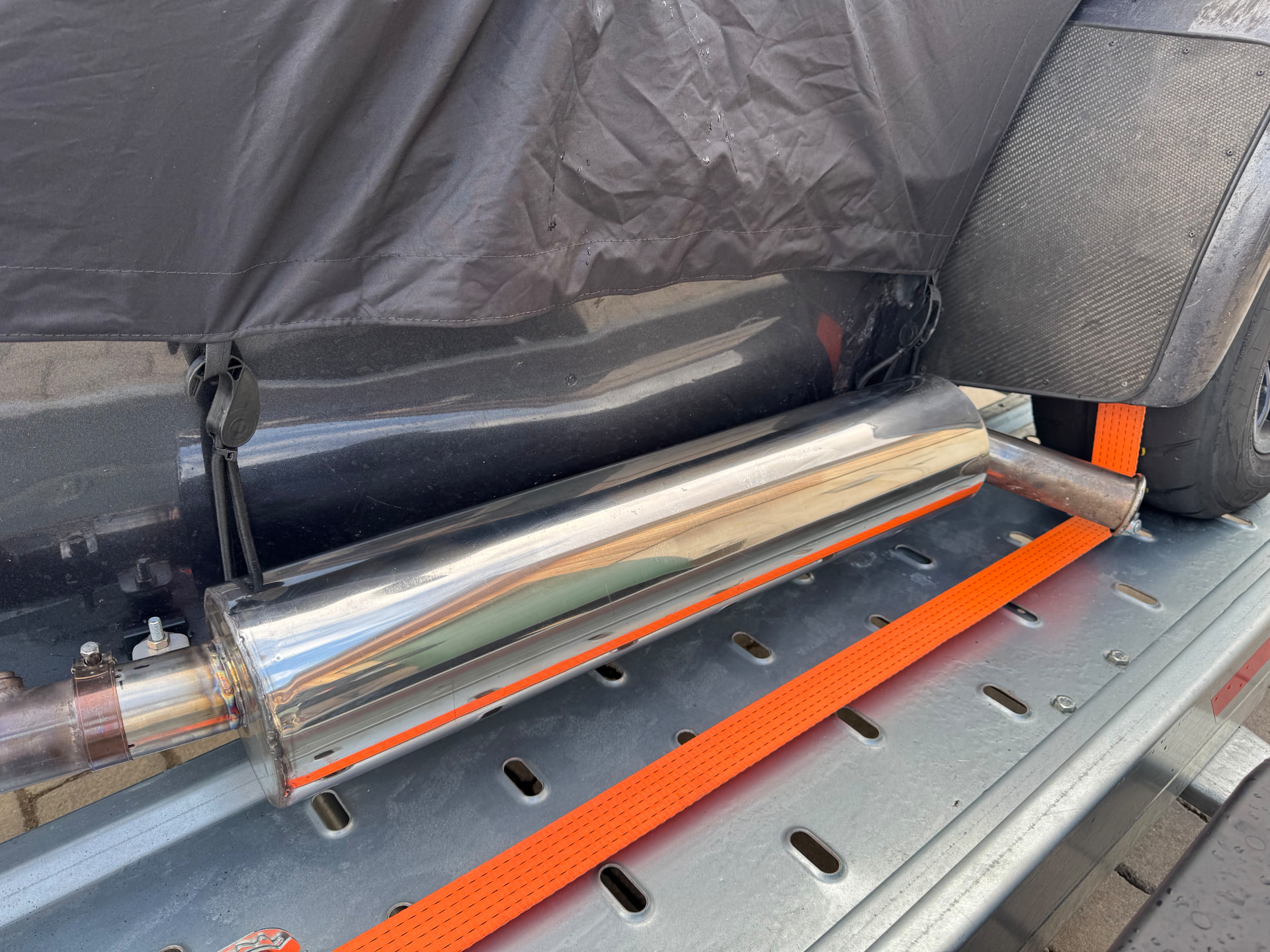 Damit haben wir auf den Tracks eigentlich nie Probleme wegen der Lautstärke. Die Chassis haben auch ein Gewinde für einen 2. Halter vorne, war bei den schweren Sidepipes mit Kat verbaut. Muss man aber eine Schablone von einem anderen Auto machen, um nicht daneben zu bohren…
