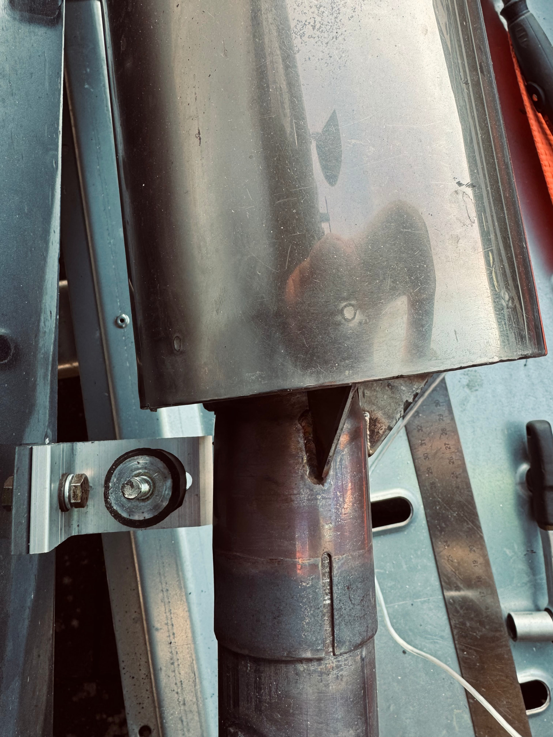 Die Eingangsrohre + Rohr innen reißen hauptsächlich durch häufige Demontage, nicht im Betrieb. Deine Versteifungsbleche sind zimelich klein im Vgl. zu dem Bild, dass ich von meinem Topf eingestellt hatte. Die müssen bis außen hin gehen, sonstdrückt es wieder nur am weichen Blech…