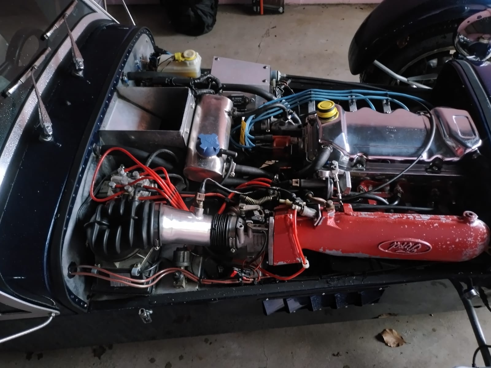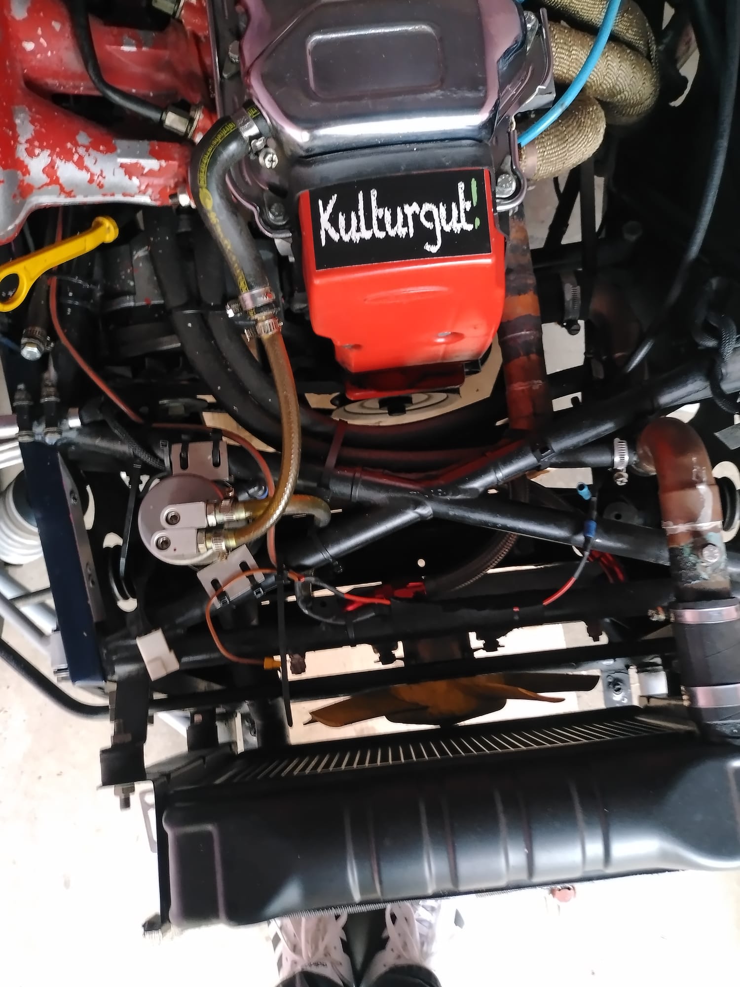 Daher komme ich um einen Austausch nicht herum. Bisher sind es einfache Gummischläuche und Oldschool-Kupferrohre. Die alten Rohre verlaufen unten am Abgaskrümmer vorbei (Rohr aus Kupfer). Vor allem bei den Schläuchen am Aluminiumausgleichsbehälter (erkennbar am blauen Deckel) sind die häufigsten Lecks.