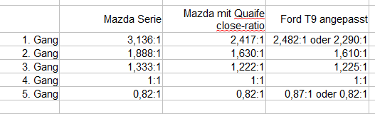 Für mich scheint es so, als könne die Quaife Option den Ist-Zustand bei 5-Gang Fahrzeugen deutlich verbessern, ähnlich wie es das angepasste Ford T9 5-Gang tut, das ja z.B. Westermann anbietet. Interessant ist, dass die Übersetzungsverhältnisse der Quaife Option für das Mazda denen des angepassten T9 sehr ähnlich sind, wenn die Zahlen auf der Westermann Seite stimmen (davon gehe ich aus, ansonsten gibt mir Carsten eh eins auf den Deckel und korrigiert sicherlich gerne